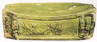 枕呈八角長(zhǎng)方形,枕面下凹,上刻折枝花卉紋,其馀各面均用印花裝飾。綠釉瓷是吉州窰主要釉色之一。始見於北宋。南宋至元均有燒製。