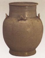 直口,溜肩,瓜楞形腹,圈足,平頂蓋,蓋頂和頸部有弦紋裝飾,肩部置四穿帶鈕。釉色泛黃。此罐雖很完整,但釉面土蝕較重。