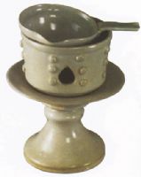 爐由高圈足托盞式爐托和筒狀爐身組成,爐內附置勺形斗一件。爐外壁透雕雙欞形通氣孔和桃形爐門。平底,內燕釉,下接爐托。爐托上部為一托盞,壁飾凸弦紋一周。爐內所置的刁斗略呈圓形,口微內斂,卡在爐口之上。