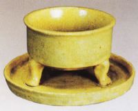 淺圓托盤,內(nèi)置筒形三足爐。內(nèi)外施釉,釉面均凈,開冰裂紋。整體造型規(guī)整,線條簡潔,流惕,施釉均勻,為南朝時期較典型的爐式,可作為斷代的標(biāo)準(zhǔn)器。部分釉面脫落。