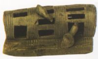 器呈捲棚式,棚頂鏤空,雨邊有進(jìn)出之門,棚下設(shè)平臺(tái);\上立一母雞低頸下望,作欲下跳姿勢(shì),平臺(tái)上立一公雞,呈呼喚母雞
