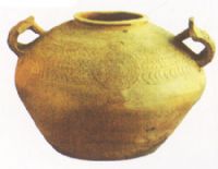 小口平沿,矮頸,斜寬肩,鼓腹,下收成平底。屑部設(shè)兩寬帶狀橫耳,其上刻割武士形象。肩部飾弦弦紋四組,其開(kāi)飾以人字篦點(diǎn)紋。輿耳垂直的瓿身雨側(cè)凸印玉璧形紋飾,璧上端鵝人面形象。器施青褐色釉,釉不及底。此器造型完美,形制較少,紋樣新穎別致,較為常見(jiàn)。