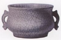爐仿青銅器的造型,施開片哥釉。哥窰為宋代五大名窯之一,此器形體古樸純厚,線條優(yōu)美,釉質(zhì)肥厚熒潤,以其典雅的造型和質(zhì)樸的釉色取騰,器形少見,為哥窰精品之作。