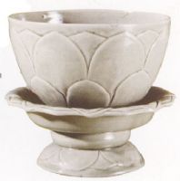 敞口,深腹,碗外壁刻浮雕狀的蓮瓣紋,下承以蓮花形托,通體施青釉。全器形如一朵盛開的蓮花,設(shè)計(jì)巧妙,裂作精細(xì),刻花犀利,施釉均勻,滋潤(rùn)光潔,青釉如冰似玉,胎質(zhì)細(xì)膩,表現(xiàn)出越窰青瓷的裂作、燒造技藝的高超。