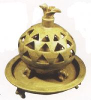 熏爐由球狀香籠,承盤組成。香籠鏤雕三層三角形孔,頂端堆貼一展翅欲飛的小鳥。此熏爐造型新穎,採用堆貼,印花,鏤空的 裝飾手法,表現(xiàn)出西製造工匠不但具有高超的 技藝,也具有較高的 審美情趣。