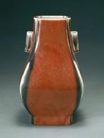 瓶長方形,直口,溜肩,鼓腹,方圈足。頸側對稱置貫耳?谙轮良甾D折處呈委角狀。通體施窯變釉。足內露白胎。外底陰刻楷書“大清光緒年制”六字雙行款。
