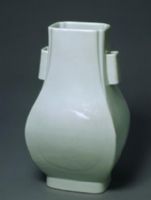 瓶通體四方形,直口,口至頸部委角,鼓腹,四方圈足。內(nèi)外通體及圈足內(nèi)均施東青釉,頸部兩側(cè)對稱置貫耳,腹部前后兩面均有杏核狀凸起。外底署青花楷書體“大清宣統(tǒng)年制”雙行六字款。