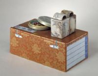 籠長(zhǎng)方形,形仿織錦書(shū)套中的線(xiàn)裝書(shū)函。書(shū)函上置一枚雙拱形紐的長(zhǎng)方形石印章和一個(gè)瓷質(zhì)圓形印泥盒。印章下有一臥槽與中空的書(shū)函箱體相通,通過(guò)此槽可給金鐘兒等鳴蟲(chóng)喂食。印泥盒內(nèi)有櫻桃、花生、蓮子、瓜子等象生瓷果品,盒底有5孔與箱體相通,盒蓋移開(kāi)后可以聽(tīng)到籠內(nèi)蟲(chóng)兒的鳴叫。書(shū)函式金鐘籠既是一件文房陳設(shè)品,又是一只可喂養(yǎng)鳴蟲(chóng)的小籠。