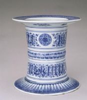 此器俗稱無(wú)擋尊,早在明永樂(lè)、宣德時(shí)期的景德鎮(zhèn)官窯就有燒造,它源自于西亞銅器,是中外商品、文化交流的產(chǎn)物。除這種器物,景德鎮(zhèn)燒造的青花花澆、大扁壺、水注、折沿盆等也仿自西亞銅器。