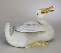各種以動物為造型的瓷器在生產(chǎn)工藝上都較為復(fù)雜,傳統(tǒng)的成型工藝有模制、雕塑、捏制、分體粘合等不同手法。該鴨采用雕塑成型法,在裝飾上則集合篦劃、彩繪等多種工藝于一體,是乾隆時期御窯廠燒造的仿生瓷雕精品之一。