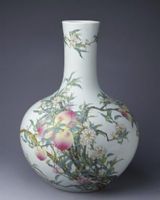 以九桃紋裝飾瓷器是雍正以來官式瓷器的題材和樣式,至光緒朝仍有仿造。雍正朝的九桃圖樣或見于粉彩天球瓶、粉彩橄欖瓶,或見于過枝紋粉彩盤。在所有雍正、乾隆和光緒時期的粉彩九桃紋瓷器上,以雍正時期的紋樣著色最為鮮艷且最多樣化,繪畫水準最高。