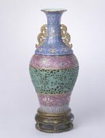 瓶身修長,敞口,溜肩,自肩處分成兩截?凇㈩i、肩呈八棱花瓣形,飾藍(lán)地粉彩花卉紋,頸部兩側(cè)貼塑金彩夔鳳耳。瓶腹中部施松石綠釉飾鏤空云龍紋,上下飾紫地粉彩勾蓮紋。通過鏤空處可以窺見內(nèi)套瓶中所繪的紅蝠紋。足部飾仰蓮瓣紋,連接仿黑漆描金底座。足底署描金“乾隆年制”四字篆書款。