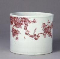 此筆筒胎堅(jiān)、釉潤(rùn)。釉里紅的發(fā)色稍微不足,但正是這種缺陷所形成的層次,為畫面平添幾分情趣。筆筒上兩幅畫面的喻意是“探花及第”和“喜上眉梢”。用這種圖案裝飾筆筒,可謂恰到好處。