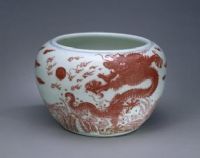 缽缸圓口內(nèi)斂,鼓腹,圈足。內(nèi)外施白釉。外壁釉里紅裝飾。以釉里紅描繪海水江崖雙龍戲珠圖案,龍睛以青花點(diǎn)飾,雙龍從海水中騰起,威武矯健,作戲珠狀。近口沿處繪青花弦線兩道。