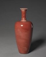 清代康熙朝晚期景德鎮(zhèn)創(chuàng)燒的豇豆紅釉屬于高溫銅紅釉,它是各種銅紅釉器物中最精妙的一種,因釉面酷似豇豆皮的顏色而得名。由于紅釉的深淺及綠色斑點(diǎn)分布在不同的部位,所以還有“美人醉”、“桃花片”、“娃娃臉”等美稱。清人洪亮吉(1746—1809年,號北江)曾作詩贊譽(yù)其釉色“綠如春水初生日,紅似朝霞欲上時。”豇豆紅釉瓷器常見有太白尊、石榴尊、菊瓣瓶、柳葉瓶、洗、印盒等小件器,主要是以文房用具為主,另見有盤,無大件器。