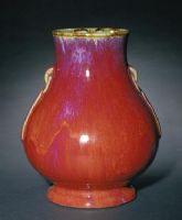 此瓶釉色鮮艷濃重,宛如燃燒的火焰般燦爛奪目,為窯變釉中“火焰紅”的典型作品。瓶的口沿處和耳部因釉層流動變薄而形成的燈草邊是雍正時期窯變釉類瓷器的特征之一。