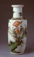 瓶盤口,直頸,斜肩,直腹,圈足。這種造型的瓶因形似古代洗衣用的棒槌,故被稱作“棒槌瓶”。內(nèi)外施白釉,外壁五彩裝飾?谶咃椉t彩,頸部繪竹石花卉兩組,肩部分布斜方錦地四組開光,開光內(nèi)分別繪山村草舍。腹壁主題圖案表現(xiàn)的是《隋唐演義》中的戰(zhàn)爭場面——秦叔寶策馬迎戰(zhàn)尉遲恭,唐王李世民和徐茂公臨城觀戰(zhàn),空間襯以矮山花樹。這種圖案俗稱“刀馬人”,清代康熙時期經(jīng)常用在陶瓷的裝飾畫面中。圈足內(nèi)施白釉。無款識。