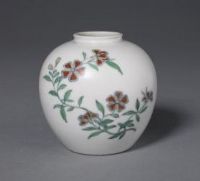 此罐造型雋秀,構(gòu)圖疏朗,瓶身只繪折枝石榴花,簡(jiǎn)潔醒目。釉上彩以紅綠彩為主,頗顯清新雅致。