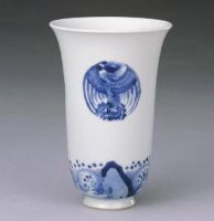 杯敞口,體瘦長,圈足。杯身繪三組團鳳紋,近底處繪礁石海水紋。足底青花雙圈內(nèi)書“大明成化年制” 三行六字楷書款。