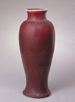 尊口微敞,短頸,肩以下漸收,脛部外撇,圈足。無款。內(nèi)壁施白釉,外壁通施郎窯紅釉,底足內(nèi)施白釉,微泛黃并開有細(xì)小紋片,俗稱“米湯底”。
