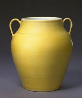 我國傳統(tǒng)低溫黃釉瓷器以明弘治時(shí)產(chǎn)品最負(fù)盛譽(yù)。由于弘治黃釉瓷器一般用“澆釉”的方法施釉,故有“澆黃”之稱,又因其黃色淺淡嬌嫩,故亦稱“嬌黃”。明代黃釉瓷器以盤、碗居多,黃釉描金罐唯弘治朝有。此類黃釉描金罐除置曲帶式耳者外,尚有置獸耳者,也有不置耳的,均屬宮廷祭祀用器。其傳世品多屬清宮舊藏。