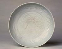 盤直口,淺弧壁,圈足。胎體堅致潔白,里外施白釉。盤心及內(nèi)壁模印云龍紋。