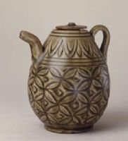 紋飾簡(jiǎn)潔清晰,刀法犀利,風(fēng)格粗獷,紋飾清晰。壺通體施青釉,釉青中泛黃。紋飾簡(jiǎn)潔,為耀州窯金代典型的風(fēng)格。