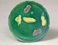 盤口呈九瓣菱花形,盤心坦平,淺壁,圈足。盤內(nèi)三彩釉下有刻劃的鷺鷥蓮花紋。其做法是先用鐵錐在胎上劃出圖案線條,經(jīng)素?zé)院笫┮跃G釉,再在蓮葉上涂葡萄紫色釉,鷺鷥與蓮花上涂黃色釉。