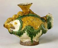 壺仿魚形,造型設(shè)計巧妙。魚背部正中為一喇叭狀菊瓣花口,一側(cè)為提梁,已殘失。魚嘴為壺流。魚身、魚鰭、魚尾用不同的釉彩裝飾并刻劃不同的花紋,魚腹下飾一荷葉,托起魚體,荷葉下為平底實足。通體施黃、綠、白三色釉。