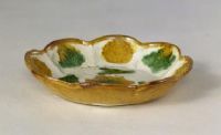 盤敞口,口沿為8瓣花口,斜壁,平底。盤內(nèi)壁模印8朵花卉,中心模印一碩大的花朵,外飾4片茨菇葉;y外以水波紋作地。盤內(nèi)施黃、綠、白三種色釉,其中白釉為地,花葉紋則以黃、綠色釉間隔排列,盤外施黃釉。