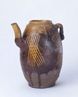 壺直口,無頸,長圓腹,淺圈足,一側(cè)置曲狀流,相對稱一側(cè)為短柄,肩部飾雙系。壺體外腹上部施黃釉,中間施紫釉,釉面飾淺黃色交叉狀復(fù)線紋共四組,下腹部及足部露紫黑色胎體。