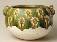 罐呈扁圓形,口內(nèi)斂,平底,口外兩側(cè)各有一系。器內(nèi)施黃釉,外壁以綠釉為地,上以白、黃、綠三色點染花朵。器施半釉不到底,露胎處呈白色。