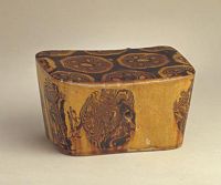 此枕造型小巧,呈長方形,枕面前低后高,前側(cè)有一通氣孔。枕面及枕側(cè)面以白、褐兩色胎土絞出的五瓣團(tuán)花紋樣數(shù)組裝飾,外罩黃釉。