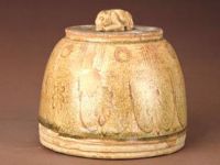 權(quán)平底,底心有一圓孔,中空,頂部飾一兔鈕。器身薄施一層青釉,釉色泛黃,施釉不到底。外壁模印蓮瓣紋一周,上為6組團花,間以條紋。