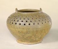 罐直口,鼓腹,足外撇?趦啥速N半環(huán)形繩系。通體施青釉,腹上部滿飾鏤孔。南方的青瓷制作水平到西晉時(shí)有了很大提高,掌握了還原焰的燒制技術(shù),青釉色彩較穩(wěn)定,胎質(zhì)細(xì)膩,胎色灰白。除印貼、鏤孔等裝飾手法外,西晉的壺、罐、尊、洗類器物的肩部和口沿多飾裝飾帶,以細(xì)密的幾何圖案為主。此器釉厚處色調(diào)較深,釉薄處則淺淡,整體效果晶瑩明澈。