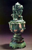 黃白色胎,胎質較松。綠釉厚潤。爐身飾四層仰蓮,有的蓮瓣不施釉,露黃白色胎。蓋頂飾一雄獅,側首,張口,翹尾,前足踩于彩球上,頸上掛三枚響鈴。姿態(tài)雄健,生動可愛,是一件難得的陶瓷工藝品。