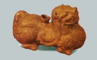 青釉瓷質(zhì)的動物造型,西晉較為流行。此辟邪似獅而帶翼,呈昂首蹲伏狀,器身刻劃、印貼胡須鬃毛、獸尾,背有一管狀流,通體施青釉。造型生動,釉面勻潤光亮,胎質(zhì)堅硬,瓷化程度高,為西晉青瓷中的佳作。