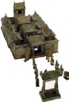 建筑群由一座牌坊和三進(jìn)院落組成。五脊歇山式牌坊與大門之間分列騎馬俑二排。院門外有八字墻,門內(nèi)有影壁,三進(jìn)院以中軸對(duì)稱列出九座懸山式平房,一座堂樓,四個(gè)前后串通的門與圍墻。前院左角置陶轎,后院左廂置灶,左角有磨、杵臼、豬羊等,院內(nèi)分立男俑17個(gè),女俑10個(gè)。這套宅院是中國(guó)古代北方民居的真實(shí)寫照。