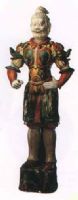 俑戴盔,穿甲,腰束繩形粗帶,圍項(xiàng)護(hù),兩肩有覆膊,甲附雙護(hù)胸及護(hù)心,下著條紋小口褲,足蹬尖頭靴,左手叉腰,右手原持有兵,立于方形座上。俑身及座施黃、綠、白三色釉。