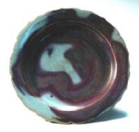 板沿、葵花口、淺腹、圈足。盤(pán)內(nèi)外施青灰釉,釉面布滿開(kāi)片,并有大片的玫瑰紫彩斑,此乃以久負(fù)盛名的鈞窯窯變工藝燒制而成。