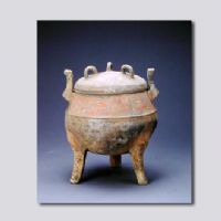 首都博物館藏。泥質(zhì)灰陶。微斂口,鼓腹,圜底,三獸形蹄足,口沿上雙附耳,耳上刻劃S形紋,半球形蓋,蓋面貼塑三臥獸為鈕,腹部淺刻渦紋。陶鼎表面有朱繪痕跡。