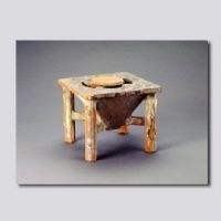 首都博物館藏。通體施低溫綠釉。明器。磨扇僅有一塊,架設(shè)在一方形臺(tái)的十字(穿孔)架上,磨臺(tái)下連著漏斗,并用四柱支架。