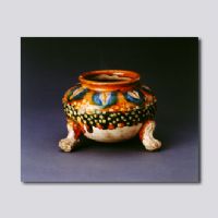 唇口,束頸,豐肩,鼓腹,圜底,下承以三獸足。爐口、頸施以深黃釉,肩部飾以三彩葉狀紋,層次分明,腹部施以藍(lán)、白釉。釉色色彩斑斕,黃、白、藍(lán)、綠等顏色相互交融浸潤,給人一種美的質(zhì)感。胎質(zhì)潔白堅(jiān)致,瑩潤細(xì)膩。