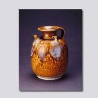 首都博物館藏。卷沿,矮頸,豐肩,圓腹,餅足。肩部飾帶狀曲柄和短直流,另兩側(cè)有對(duì)稱雙系。通體施黃釉,施釉不及底。器身刻有跳刀席紋,并在肩部點(diǎn)綴藍(lán)斑。胎質(zhì)細(xì)密,呈灰白色。釉面有細(xì)碎開片。唐代黃釉藍(lán)彩器,主要產(chǎn)于河南郟縣黑虎澗窯和黃道窯,除黃釉外,還有黑釉,茶葉末釉系,系上飾天藍(lán)色或月白色斑。