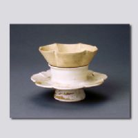 首都博物館藏。盞呈六瓣蓮花形。敞口,淺斜腹,圈足。通體施白釉,釉下有白色化妝土,外壁施釉不到底,足脊有支燒痕。托由托杯及托盤(pán)相連而成,撇口,直壁,仰蓮式托盤(pán)。托口高于托盤(pán)。高圈足外撇。通體施白釉。