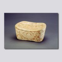 首都博物館藏。元寶形,枕面中心以珍珠紋為地,刻“齊壽”二字,四周刻卷草紋邊飾,“齊”字下腳空隙處,巧飾葉紋壓肩。枕四壁以珍珠紋為地,刻纏枝菊花,底刻“大吉”字樣;y凹處刻劃較深,經(jīng)燒造后呈褐色。珍珠地紋飾,源于唐代金銀器上的鏨花裝飾,河南密縣窯在唐代首先應用于瓷器裝飾。其工藝是用管狀竹木或金屬工具,在施好化妝土的坯體上戳印而成,圓點周圍露出胎體本色,中心是白色,再施以透明釉。經(jīng)高溫燒造后,形成色調(diào)對比強烈的藝術效果。