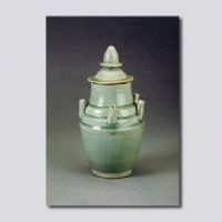 首都博物館藏。直口,粗頸,肩部呈階梯狀,飾向上五管,收腹,圈足,寶剎式蓋。通體施青釉,釉面青翠,有大開片,釉層清澈,胎體厚重。