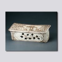 首都博物館藏。長方形。枕面出檐,正面及各側(cè)面都繪畫黑彩紋飾:枕面開光內(nèi)繪馬旁一人拱手而立與一轉(zhuǎn)首回身的婦人對(duì)語,另一長髯老者躲在山石后窺探。枕兩端立面為開光荷花,內(nèi)側(cè)立面為開光牽;ǎ嬅嬲w運(yùn)用了水墨畫手法,其間房舍、山石、團(tuán)云、樹木遠(yuǎn)近點(diǎn)染,充滿了生活氣息。枕底有陽線雙邊楷書“王氏壽明”印款。
