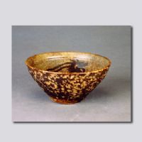 首都博物館藏。侈口,斜腹內(nèi)斂,淺圈足,內(nèi)外壁施灰褐釉。器內(nèi)飾紫黑色的鸞鳳蛺蝶紋,為吉州窯特有的剪紙貼花工藝,外為玳瑁斑紋。胎體為黑色。剪紙貼花的做法是先在坯體上施一層含鐵量高的釉,將剪紙紋樣貼上,然后再施一層含鐵量低的釉,揭掉剪紙,高溫?zé),淺色的“地”上形成醬黑色剪紙紋樣。外壁的玳瑁斑是采用兩種不同含量的氧化鐵釉料,在器的外部均勻地涂赭黑色釉,次灑黃釉斑點(diǎn),燒成玳瑁狀窯變紋樣,色澤如海洋動(dòng)物玳瑁的甲殼。吉州窯的剪紙貼花工藝是中國(guó)古代黑釉瓷器中的名貴品種,它具有一種別有韻味的藝術(shù)感染力。