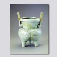 首都博物館藏。洗口,束頸,雙立耳,袋形腹,柱足。仿青銅器分檔鬲形?谘乜淘评准y一周,腹刻凸起的饕餮紋。胎體厚重、堅硬,釉色光潔瑩潤。